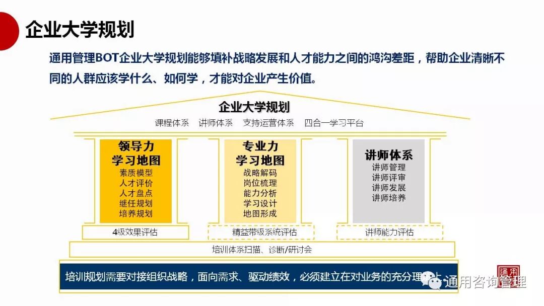 7月下旬,何焰老师通过两个月的详细调研与设计,以关键岗位的职业生涯规划和能力发展路径为人才梯队培养的核心主轴,在金田企业大学培训规划工作会议上,从企业文化、办学方针、总体规划、组织体系、课程体系、讲师体系、运营体系资源体系等八大模块,向在场的领导班子进行了企业大学五年培训规划的详细工作汇报,并获得了领导班子的一致认可,并且在同一天通过了人才培养八大模块的实施方案。